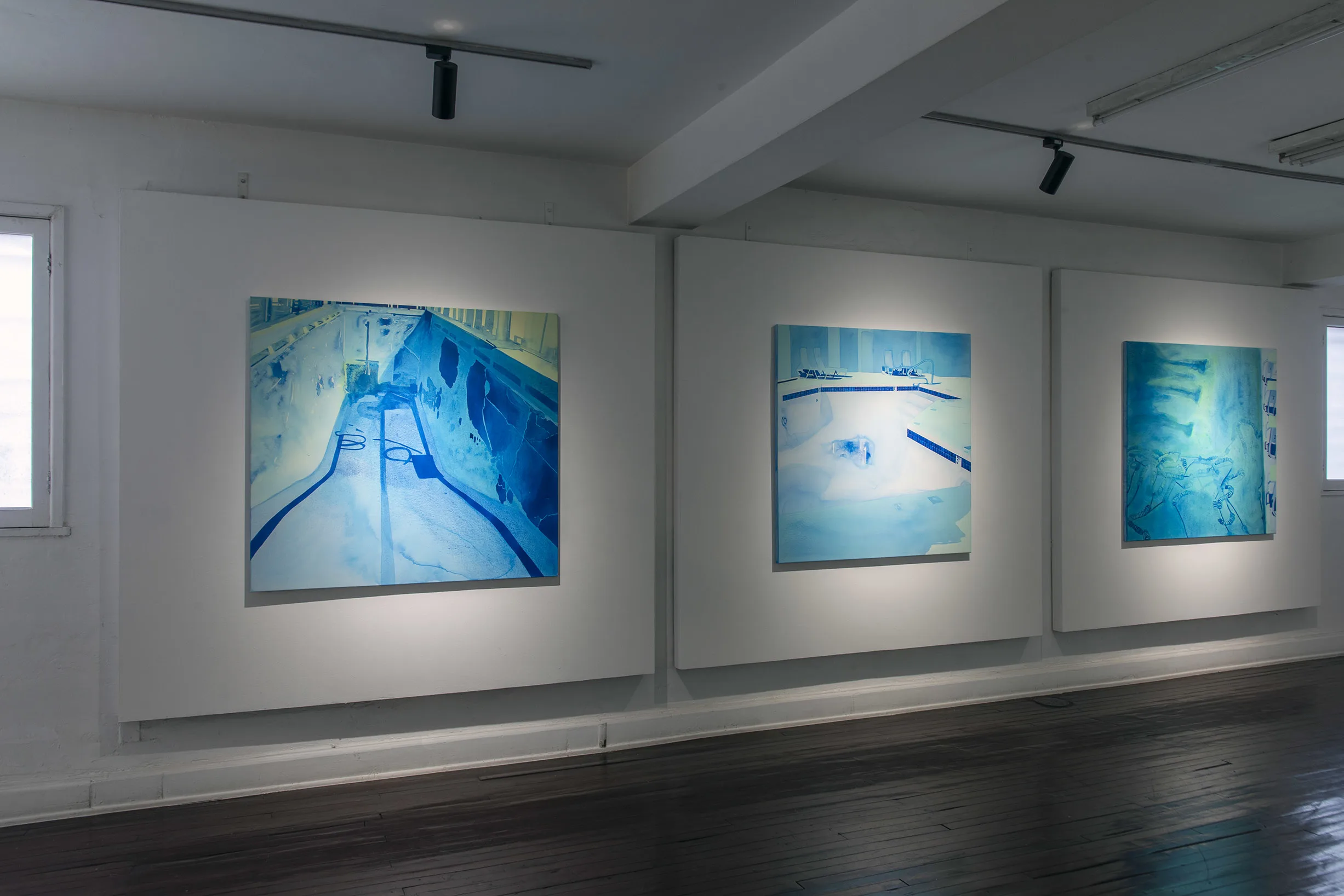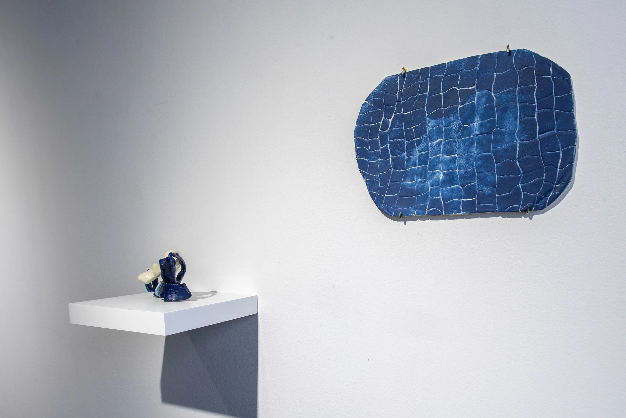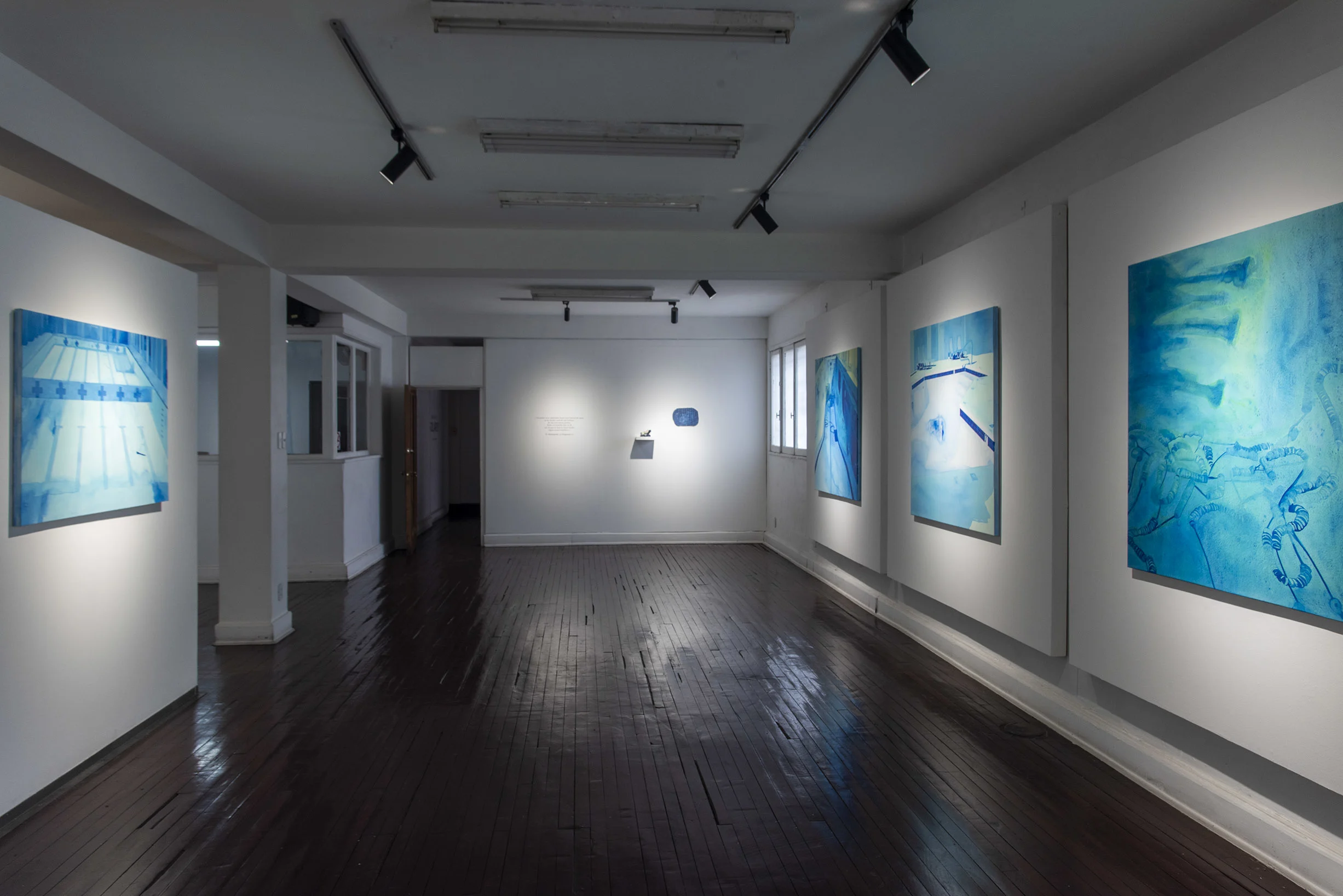La muestra individual “Corrientes que perdieron su cauce” expone la investigación de 2 años que la artista Nicole Tijoux ha venido desarrollando, en una reflexión que busca imaginar realidades alternativas donde el agua no es más que un lejano recuerdo, un elemento fundamentalmente ausente que, sin embargo, revela su presencia en las huellas de su paso. Usando técnicas como pintura, cianotipo y cerámica, las obras que componen la muestra despliegan un imaginario poblado de piscinas abandonadas, remanentes de posibles plantas y animales acuáticos, paisajes y referencias mitológicas alrededor de las aguas y el hábitat de las profundidades marinas, de donde emergen toda clase de despojos, sedimentos y restos fósiles. La variedad técnica y formal de cada una de las obras es unificado por una paleta centrada casi exclusivamente en el color azul, donde se realza el valor del montaje como factor central de muestra, no sólo para contener los testimonios de lo que pudo haber habido realmente en esos parajes sino para mostrar la imaginación misma como montaje cuya fluidez va anidando en la memoria de las culturas.