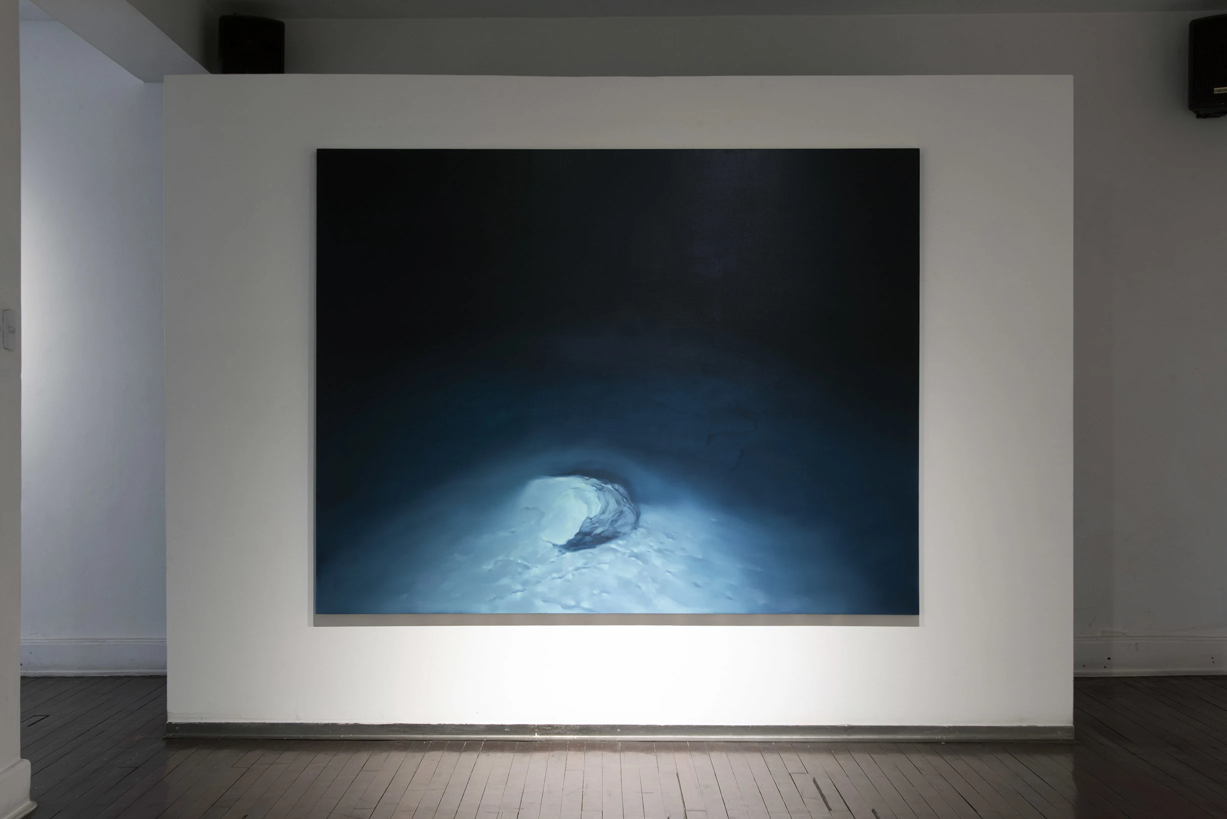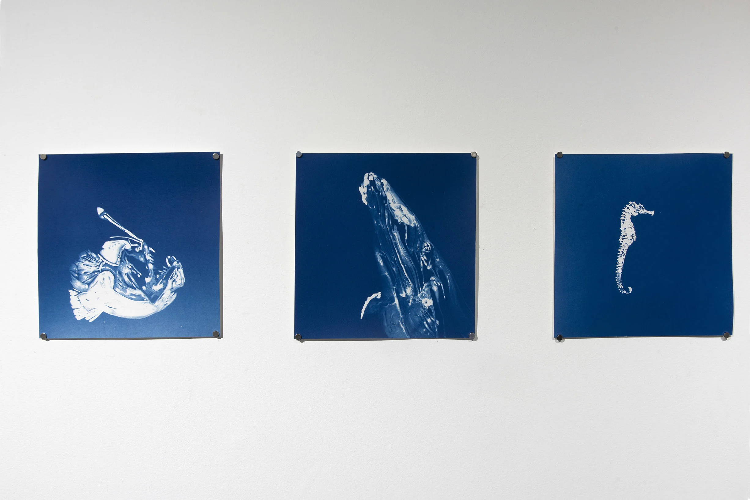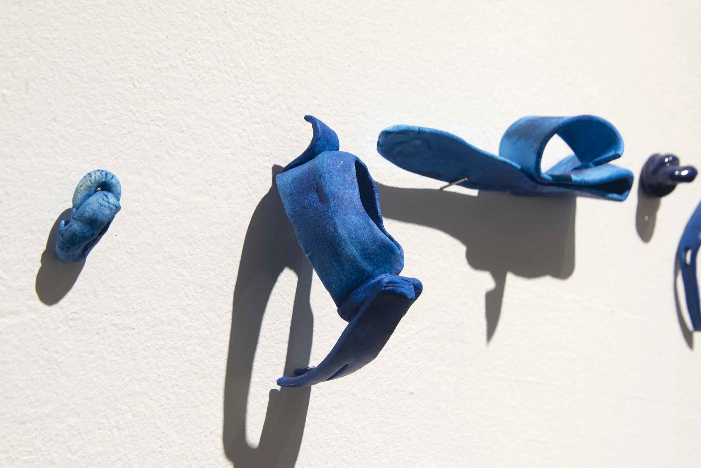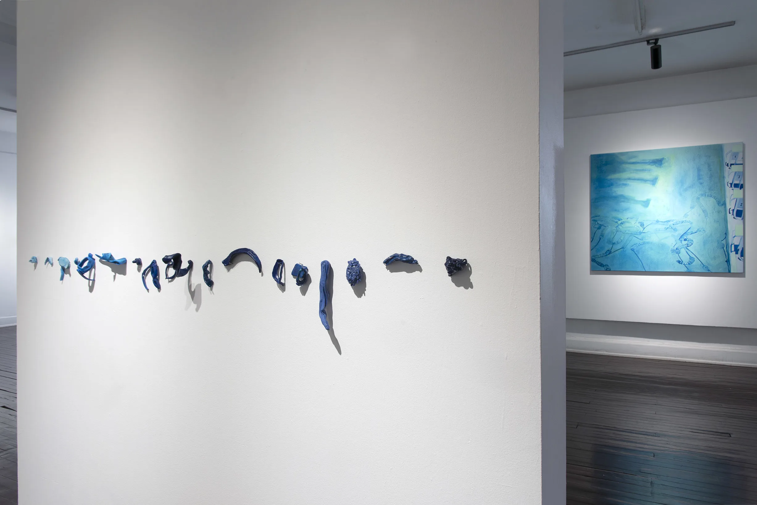 La muestra individual “Corrientes que perdieron su cauce” expone la investigación de 2 años que la artista Nicole Tijoux ha venido desarrollando, en una reflexión que busca imaginar realidades alternativas donde el agua no es más que un lejano recuerdo, un elemento fundamentalmente ausente que, sin embargo, revela su presencia en las huellas de su paso. Usando técnicas como pintura, cianotipo y cerámica, las obras que componen la muestra despliegan un imaginario poblado de piscinas abandonadas, remanentes de posibles plantas y animales acuáticos, paisajes y referencias mitológicas alrededor de las aguas y el hábitat de las profundidades marinas, de donde emergen toda clase de despojos, sedimentos y restos fósiles. La variedad técnica y formal de cada una de las obras es unificado por una paleta centrada casi exclusivamente en el color azul, donde se realza el valor del montaje como factor central de muestra, no sólo para contener los testimonios de lo que pudo haber habido realmente en esos parajes sino para mostrar la imaginación misma como montaje cuya fluidez va anidando en la memoria de las culturas.